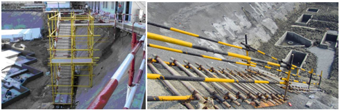 (8)深基坑施工應(yīng)設(shè)置扶梯、入坑踏步及專(zhuān)用載人設(shè)備或斜道等設(shè)施。采用斜道時(shí),應(yīng)加設(shè)間距不大于400mm的防滑條等防滑措施。嚴(yán)禁沿坑壁、支撐或乘運(yùn)土工具上下。