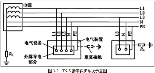 TN-S系統(tǒng)為電源中性點(diǎn)直接接地時(shí),電氣設(shè)備外露可導(dǎo)電部分通過零線接地的接零保護(hù)系統(tǒng)。N為工作零線,PE為專用保護(hù)接地線,即設(shè)備外殼連接到PE上。