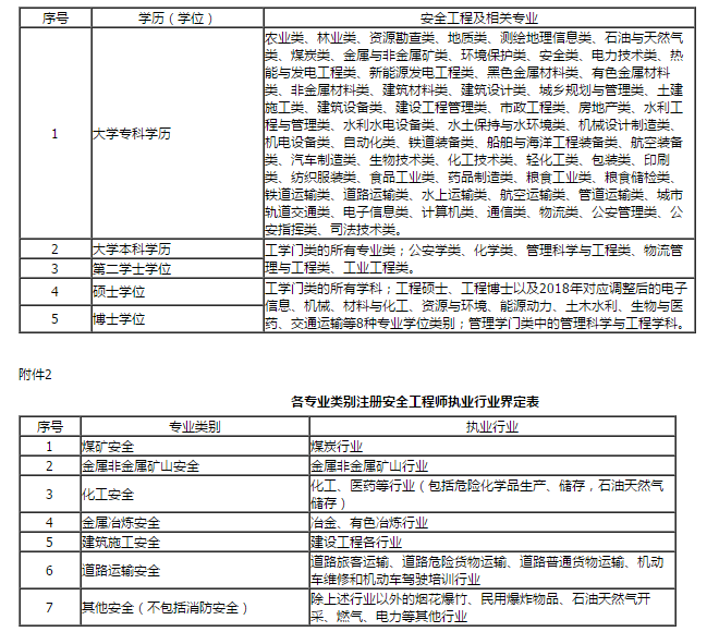 (一)具有安全工程及相關(guān)專業(yè)(附件1)大學(xué)專科學(xué)歷,從事安全生產(chǎn)業(yè)務(wù)滿5年;或具有其他專業(yè)大學(xué)??茖W(xué)歷,從事安全生產(chǎn)業(yè)務(wù)滿7年。