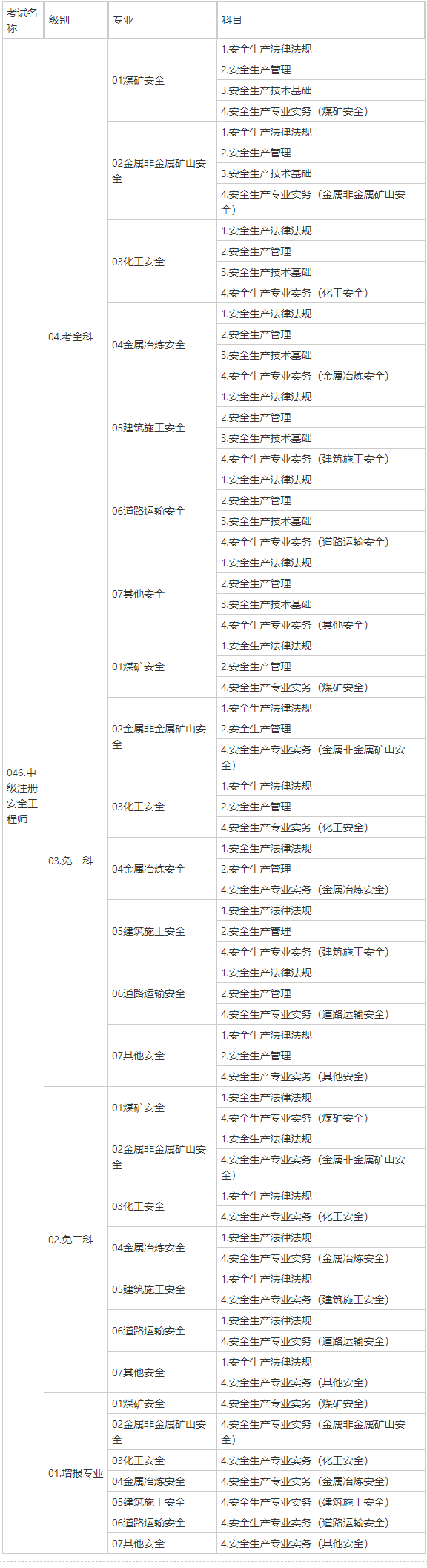 注:“安全生產(chǎn)專業(yè)實(shí)務(wù)”科目分為:煤礦安全、金屬非金屬礦山安全、化工安全、金屬冶煉安全、建筑施工安全、道路運(yùn)輸安全和其他安全7個(gè)專業(yè)類別。