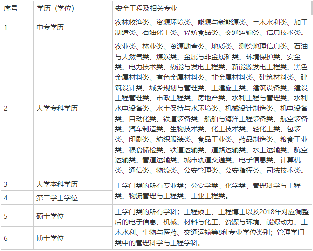 (一)具有安全工程及相關(guān)專業(yè)大學(xué)??茖W(xué)歷,從事安全生產(chǎn)業(yè)務(wù)滿5年;或具有其他專業(yè)大學(xué)??茖W(xué)歷,從事安全生產(chǎn)業(yè)務(wù)滿6年。