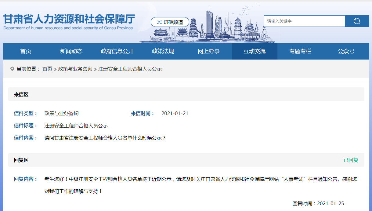 信件內(nèi)容:請問甘肅省注冊安全工程師合格人員名單什么時候公示?