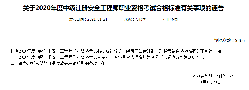 根據(jù)中華人民共和國人力資源和社會保障部發(fā)布的通告,2020年度中級注冊安全工程師職業(yè)資格考試各專業(yè)、各科目合格標準均為60分(試卷滿分均為100分)。
