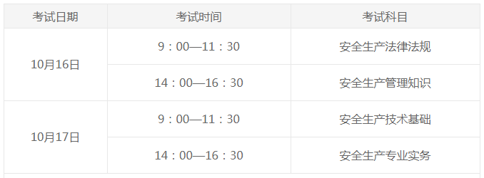 2021年安全工程師考試時間10月16、17日,具體考試科目如下:
