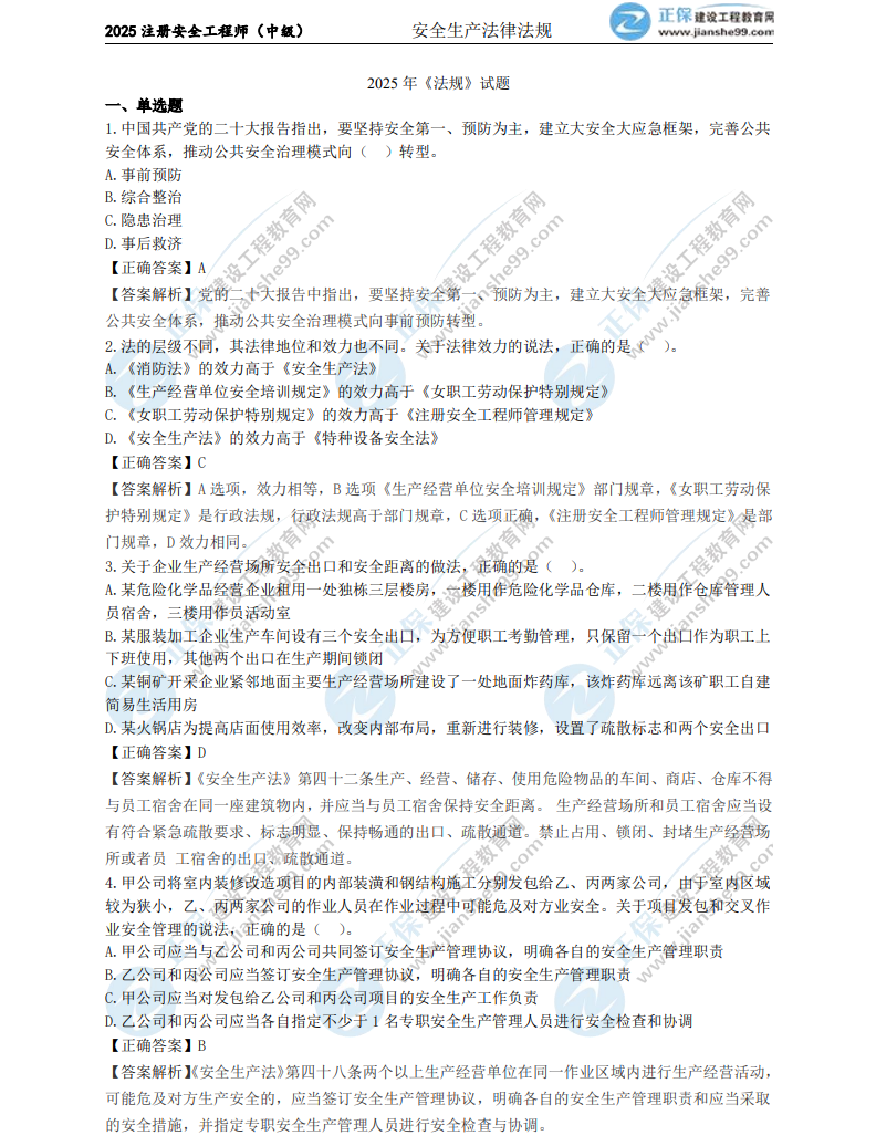 2025年中級(jí)安全工程師《法律法規(guī)》考試結(jié)束,考生們最關(guān)心的肯定是這一科目試題及答案。建設(shè)工程教育網(wǎng)考后會(huì)依據(jù)考生反饋,及時(shí)匯總中級(jí)安全工程師《法律法規(guī)》的試題及答案,期望能給各位考生提供幫助!