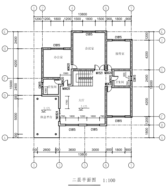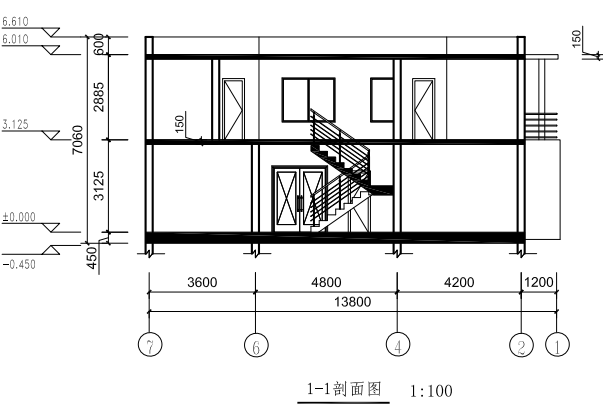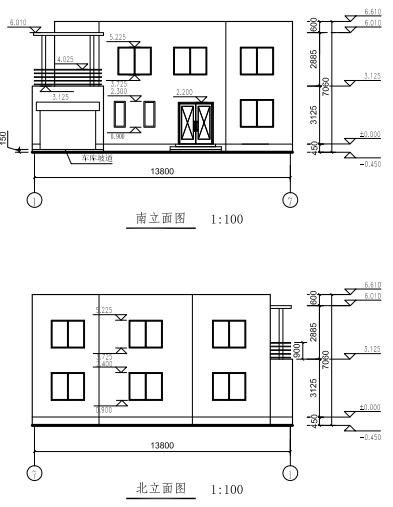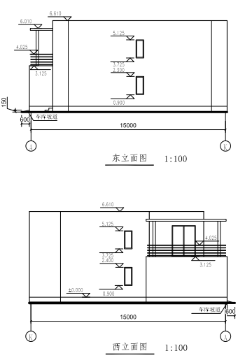 ?。?)已知建筑的內(nèi)外墻厚均為240,沿軸線居中布置,按照平、立面圖紙建立房屋模型,樓梯、大門入口臺階、車庫入口坡道、陽臺樣式參照圖自定義尺寸,二層棚架頂部標(biāo)高與屋頂一致,棚架梁截面高15 0mm,寬100mm,棚架梁間距自定,其中窗的型號C1815,C0615,尺寸分別為800×1500mm, 600×1500mm;