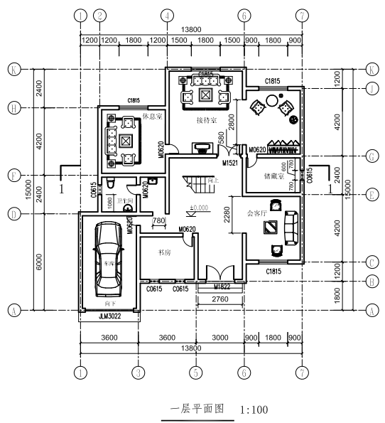 (2)請對一層室內(nèi)進行家具布置,可以參考給定的一層平面圖。 (5分)