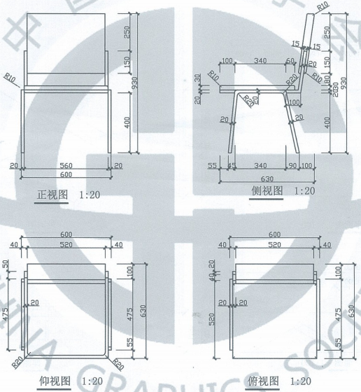 4、圖為某椅子模型。請(qǐng)按圖示尺寸要求新建并制作椅子構(gòu)件集,椅子靠背與坐墊材質(zhì)設(shè)為“布”,其他設(shè)為“鋼”。最終結(jié)果以“椅子”為文件名保存在考生文件夾下。(20分)