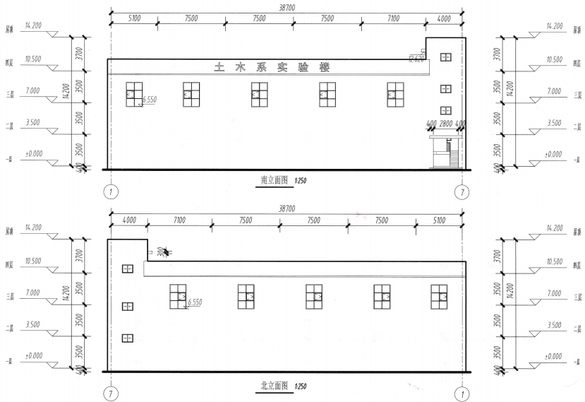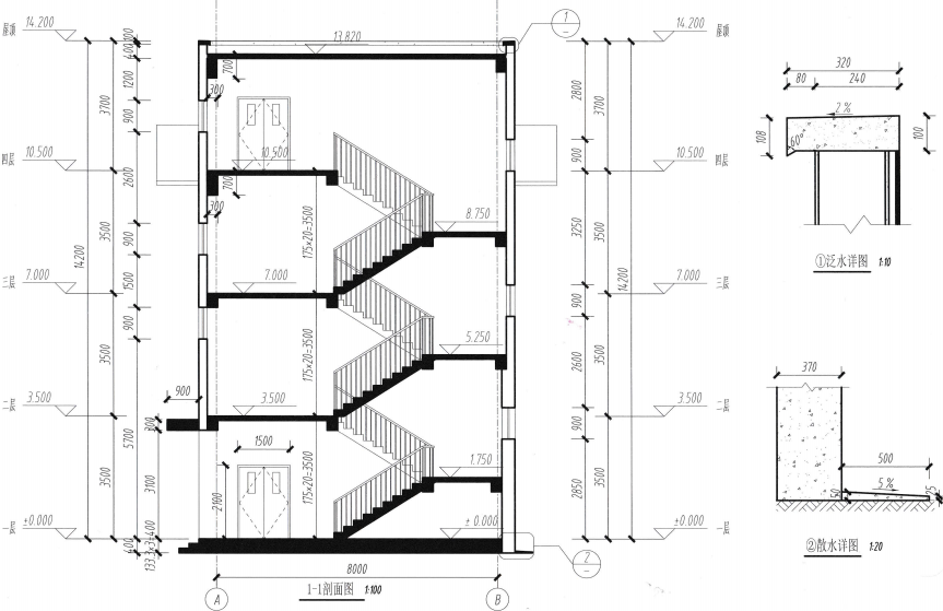 2)根據(jù)給出的圖紙創(chuàng)建建筑形體,包括墻、柱、門、窗、屋頂、梁、樓板、樓梯、散水、壓頂泛水、模型文字。其中,門窗要求尺寸與位置正確,窗臺(tái)高度參見圖紙。未標(biāo)明尺寸不作要求。(5分)
