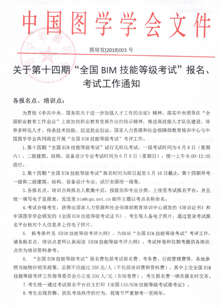 第十四期全國BIM等級考試報名時間公布,即日起至5月16日,一級考試時間為6月8日,二級建筑、結(jié)構(gòu)、設(shè)備專業(yè)考試時間為6月9日,請廣大考生盡早報名,積極備考,祝大家順利備考!
