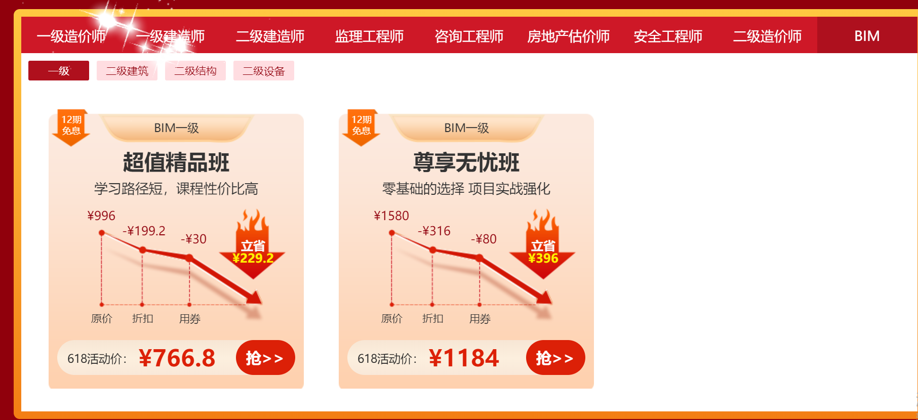618BIM課程低價(jià)來(lái)襲,12期免息+折上立減課程低至75折,每期只需63.9元,趕快來(lái)看看吧~