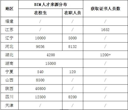 1、來(lái)源分布。11個(gè)省市提供的數(shù)據(jù)表明,BIM人才主要來(lái)源于在校學(xué)生,以及接受BIM相關(guān)培訓(xùn)的企業(yè)在崗人員,詳見(jiàn)表所示。
