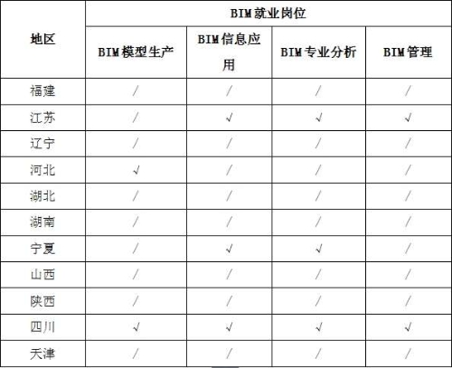 3、就業(yè)崗位分布。從11個(gè)省市的BIM就業(yè)崗位分布來(lái)看,不同地區(qū)的企業(yè)對(duì)BIM人才的崗位需求也各不相同,BIM技術(shù)應(yīng)用發(fā)達(dá)的地區(qū)更需要能將BIM技術(shù)與生產(chǎn)過(guò)程融合的復(fù)合型人才,不局限于BIM建模工作,例如江蘇省企業(yè)招聘的人員以BIM信息應(yīng)用,BIM專(zhuān)業(yè)分析和BIM項(xiàng)目管理為主。