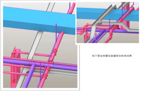 在完成管線碰撞檢測及凈空分析后,依據(jù)施工順序和規(guī)范對原先存在的碰撞處管線進(jìn)行合理調(diào)整優(yōu)化,在滿足凈空要求的同時,管線用量達(dá)到最優(yōu),提升整體美觀程度;進(jìn)行三維可視化交底,并可以依據(jù)調(diào)整后的模型出具剖面圖和平面CAD施工圖,有效的指導(dǎo)施工,提高施工效率,避免管線碰撞造成的返工及人材機(jī)的浪費。
