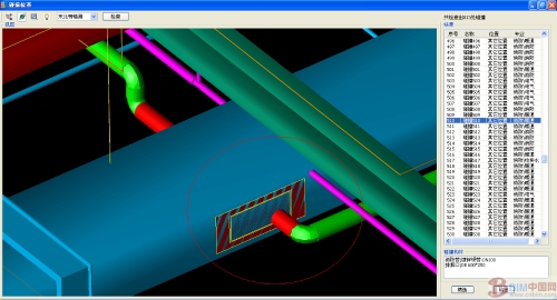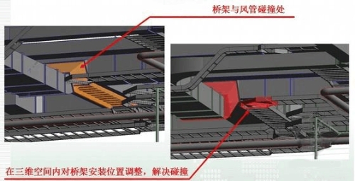 上述圖,可以看出發(fā)生碰撞的地方比較明顯,通過(guò)碰撞檢測(cè)可以看出橋架與風(fēng)管有明顯的沖突,通過(guò)協(xié)商,把橋架的位置進(jìn)行調(diào)整,解決碰撞。