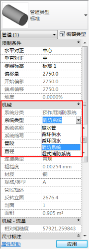 未連接機(jī)械設(shè)備時(shí)可自由選擇系統(tǒng)類型。一旦連接機(jī)械設(shè)備,且將管道系統(tǒng)類型改為與機(jī)械設(shè)備一致后,系統(tǒng)類型與系統(tǒng)名稱都將無(wú)法更改。