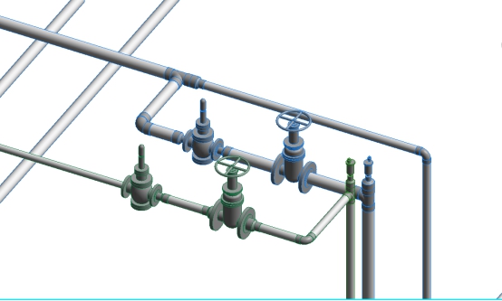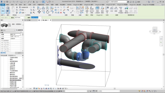 完成基本模型后即可進行管道與管道、管道與土建的碰撞檢查,因為圖紙在設計時也是分開的,會產(chǎn)生許多問題,因此才會有施工前的圖紙審查,如果再用BIM技術就可以很直觀的看到圖紙出現(xiàn)問題的位置在哪里,并進行修改,在施工過程中也避免了很多麻煩。