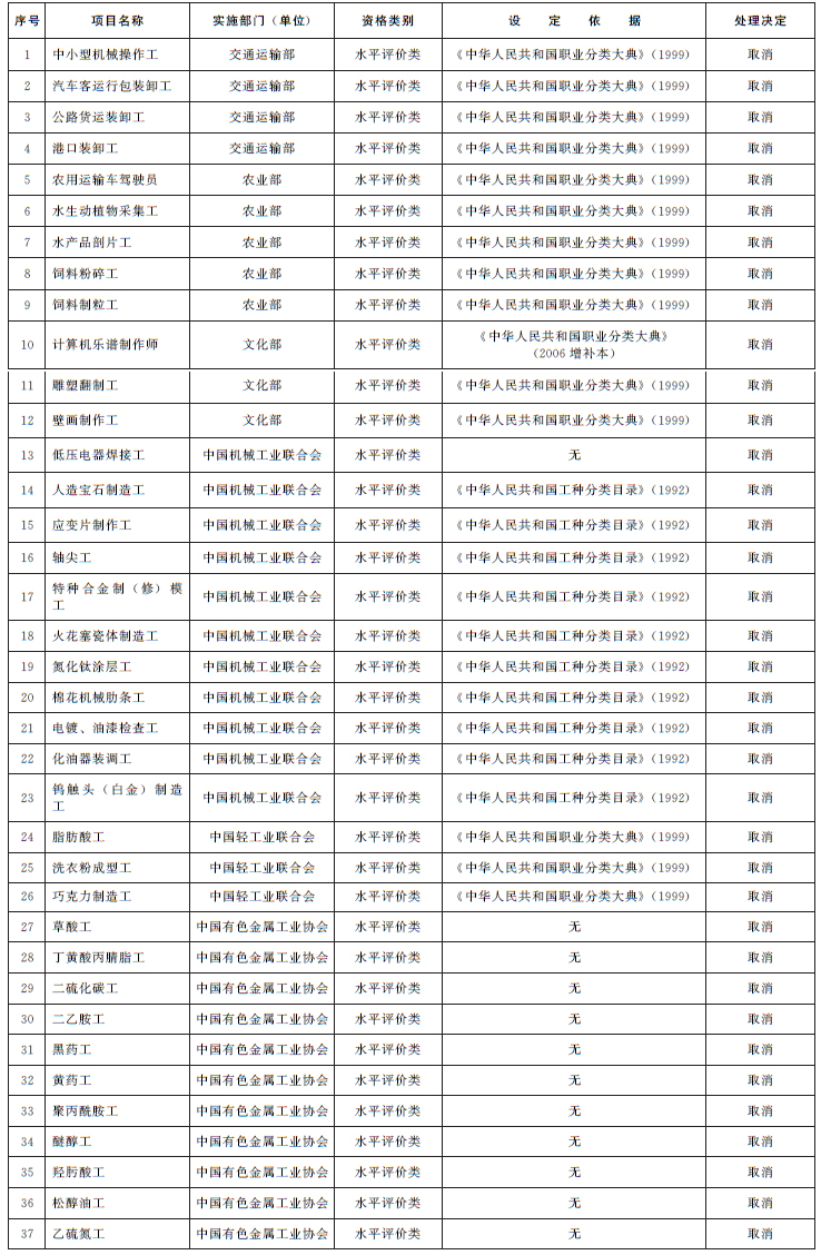二、取消的技能人員職業(yè)資格許可和認(rèn)定事項(共計37項,均為水平評價類)