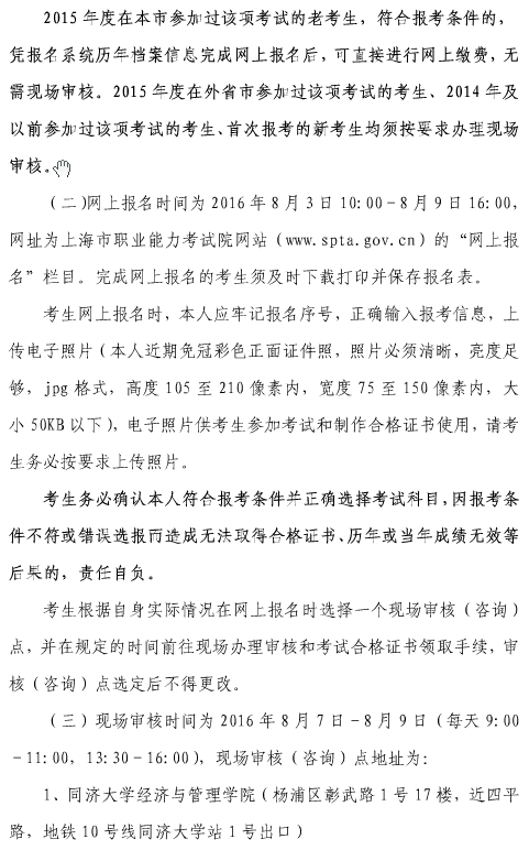 摘要:報(bào)名時(shí)間:2016年8月3日10:00~8月9日16:00;現(xiàn)場(chǎng)資格審核時(shí)間:2016年8月7日—8月9日(每天9:00-11:00,13:30-16:00);打印準(zhǔn)考證:2016年10月12日10:00—10月13日16:00;考試時(shí)間:2016年10月15日、16日;繳費(fèi)截止時(shí)間:2016年8月12日16:00。