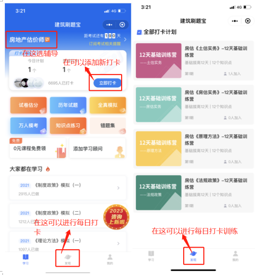 打卡時間:即日起——教材出版后 打卡形式:掃碼進入建筑刷題寶進行打卡 打卡周期:12天 每日安排:1天1個知識點+5道對應練習題,高頻知識點,學會練會為止