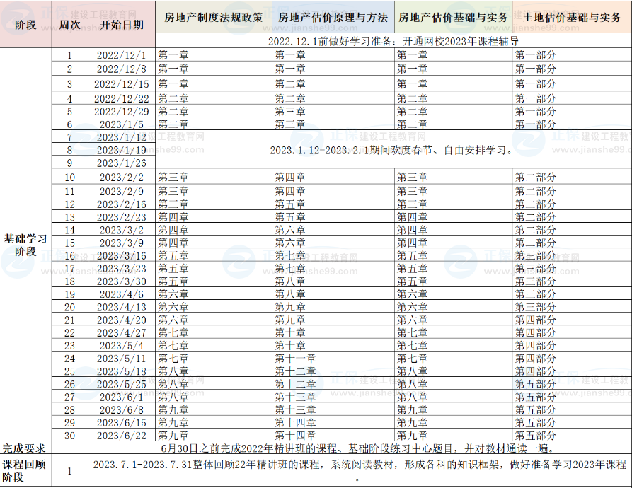 2、已報網(wǎng)校2023年房地產(chǎn)估價師輔導(dǎo)高效班/無憂班的同學(xué),將由班主任老師根據(jù)您的信息反饋及學(xué)習(xí)時間制定更詳盡的計劃表,如與本表不一致,請以班主任老師制定的學(xué)習(xí)計劃為準(zhǔn)。