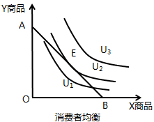在切點(diǎn)E上,無(wú)差異曲線U2和預(yù)算線AB的斜率相等,無(wú)差異曲線斜率的絕對(duì)值是商品邊際替代率MRSXY。
