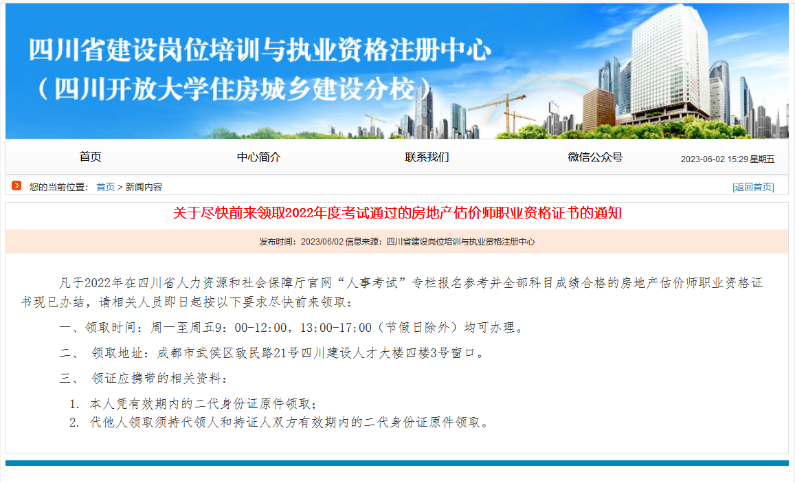 關(guān)于領(lǐng)取2022年度考試通過的四川房地產(chǎn)估價師職業(yè)資格證書的通知