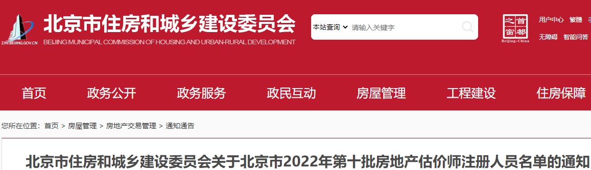 北京市住房和城鄉(xiāng)建設(shè)委員會(huì)關(guān)于北京市2022年第十批房地產(chǎn)估價(jià)師注冊(cè)人員名單的通知