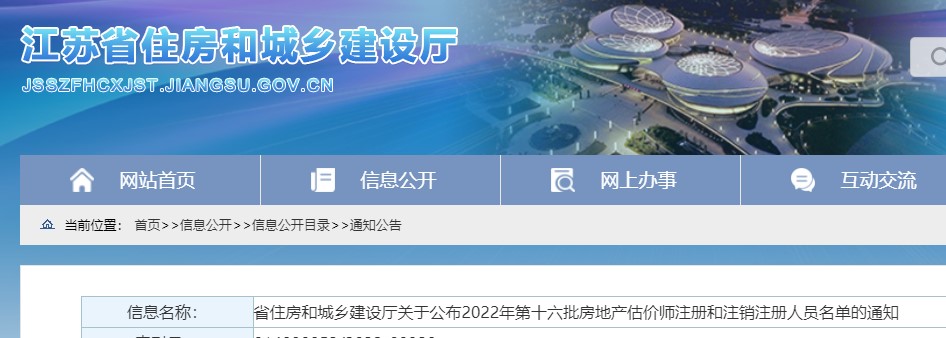 江蘇于公布2022年第十六批房地產(chǎn)估價師注冊和注銷注冊人員名單的通知