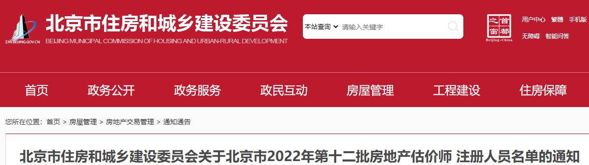 北京市住房和城鄉(xiāng)建設(shè)委員會(huì)關(guān)于北京市2022年第十二批房地產(chǎn)估價(jià)師