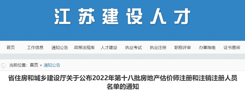 江蘇關于公布2022年第十八批房地產(chǎn)估價師注冊和注銷注冊人員名單通知