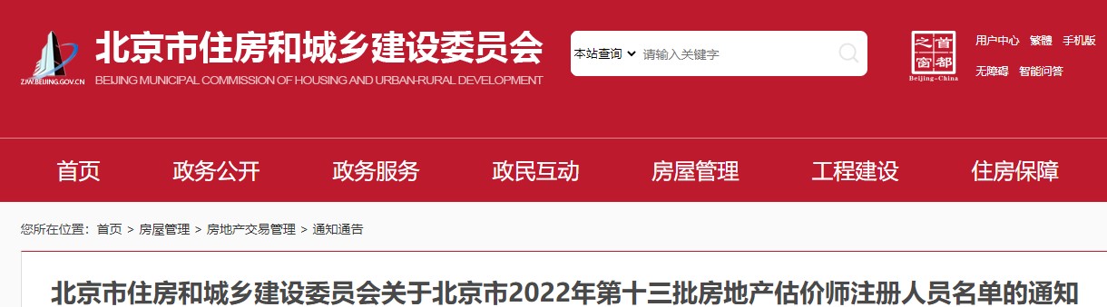 北京市住房和城鄉(xiāng)建設(shè)委員會關(guān)于北京市2022年第十三批房地產(chǎn)估價師注冊人員名單的通知