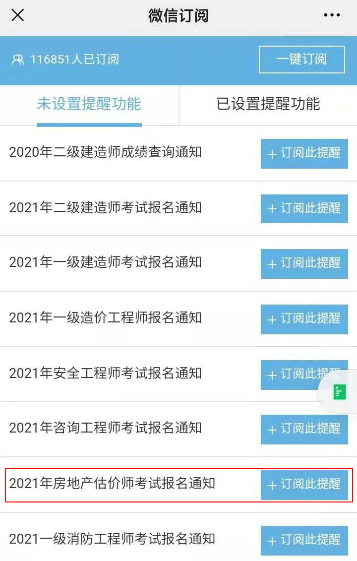 第三步:選擇“2021年房地產(chǎn)估價師考試報名通知”-訂閱此提醒