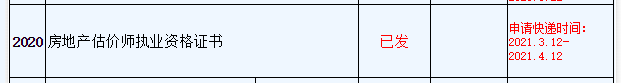 根據浙江人事考試網發(fā)布的《 資格證書領取時間安排表》,浙江2020年房地產估價師證書已發(fā),申請快遞時間:3月12日至4月12日。