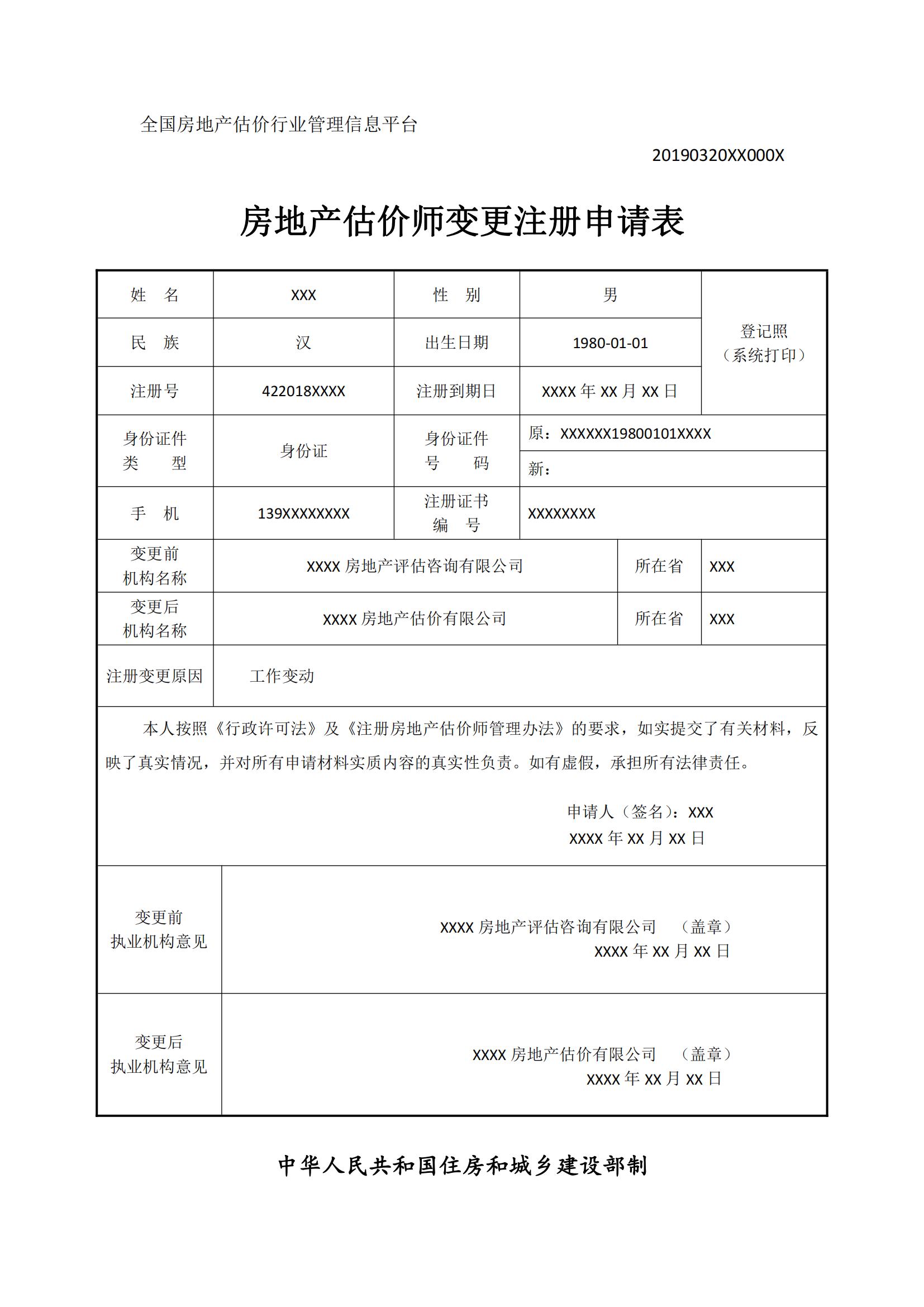 房地產(chǎn)價(jià)格評(píng)估人員注冊(cè)執(zhí)業(yè)資格認(rèn)定(變更注冊(cè))辦理材料中包含《房地產(chǎn)估價(jià)師變更注冊(cè)申請(qǐng)表》掃描件,樣本如下: