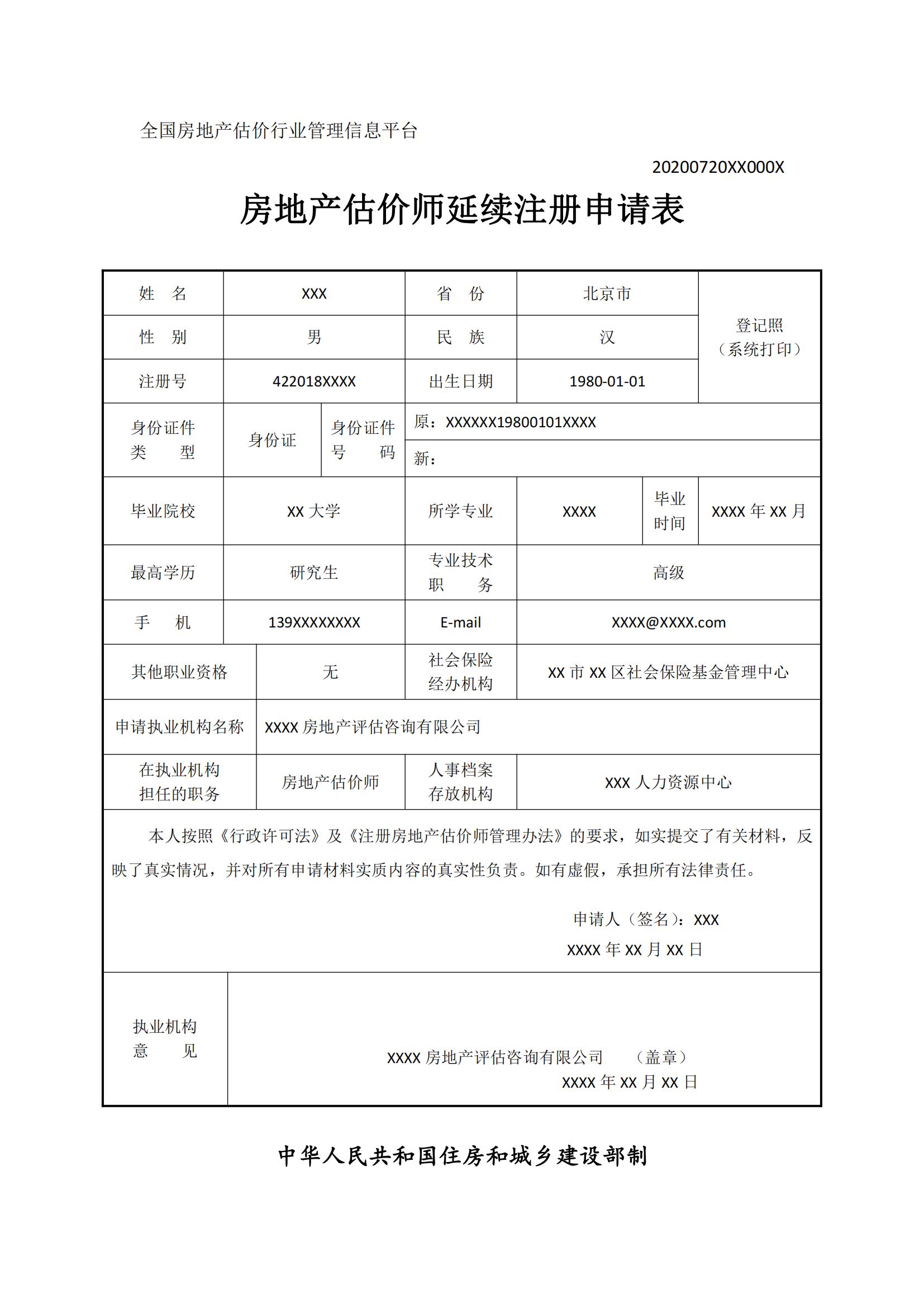 房地產(chǎn)價(jià)格評(píng)估人員注冊(cè)執(zhí)業(yè)資格認(rèn)定(延續(xù)注冊(cè))辦理材料中包含《房地產(chǎn)估價(jià)師延續(xù)注冊(cè)申請(qǐng)表》掃描件,樣本如下: