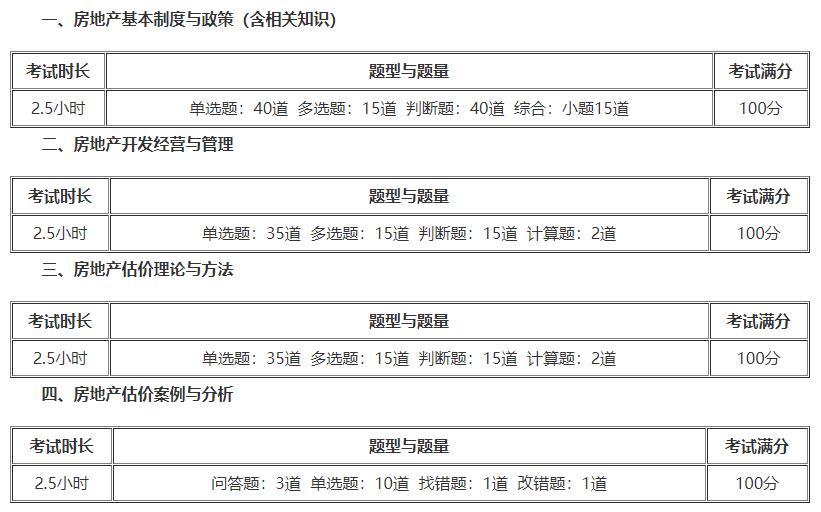 其中,房地產(chǎn)基本制度與政策(含相關(guān)知識(shí))有單選:40道、多選:15道、判斷:40道、綜合:小題15道;房地產(chǎn)開發(fā)經(jīng)營(yíng)與管理有單選:35道、多選:15道、判斷:15道、計(jì)算:2道;房地產(chǎn)估價(jià)理論與方法有單選:35道、多選:15道、判斷:15道、計(jì)算:2道;房地產(chǎn)估價(jià)案例與分析有問答:3道、單選:10道、找錯(cuò):1道、改錯(cuò):1道。
