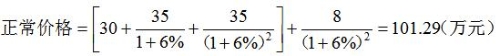 某住宅的建筑面積為100m2,買賣合同約定成交價為10000元/m2,價款分三期支付,首付30萬,剩余兩期分別于第一年和第二年年末支付35萬元。交易稅費均由買方承擔(dān)。已知買方應(yīng)繳納的稅費為3萬元,賣方應(yīng)繳納的稅費為8萬元,并在支付最后一筆余款時繳納。若將該交易實例作為可比實例,年折現(xiàn)率為6%,則對其建立比較基礎(chǔ)后的總價為( )萬元。