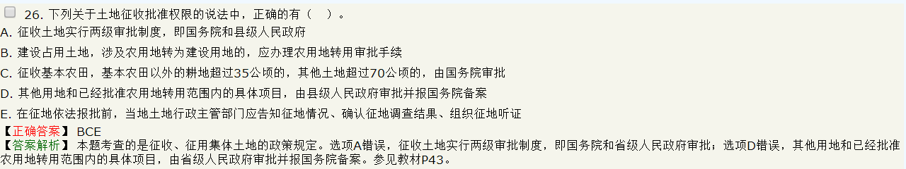 【解析】本題考查的是征收集體土地的政策規(guī)定。征收土地批準(zhǔn)權(quán)限的規(guī)定:(1)征收土地實(shí)行兩級(jí)審批制度,即由國(guó)務(wù)院和省級(jí)人民政府審批;(2)建設(shè)占用土地,涉及農(nóng)用地轉(zhuǎn)為建設(shè)用地的,應(yīng)辦理農(nóng)用地轉(zhuǎn)用審批手續(xù);(3)征收基本農(nóng)田,基本農(nóng)田以外的耕地超過35公頃的,其他土地超過70公頃的,由國(guó)務(wù)院審批;(4)其他用地和已經(jīng)批準(zhǔn)農(nóng)用地轉(zhuǎn)用范圍內(nèi)的具體項(xiàng)目,由省級(jí)人民政府審批并報(bào)國(guó)務(wù)院備案。參見教材P43.