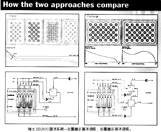 為了彌補傳統(tǒng)儲冰系統(tǒng)的這些缺點,瑞士 DELROC AG 公司發(fā)展出了一套混合式(hybrid)的儲冰系統(tǒng)。這種系統(tǒng)的熱交換器管排(heat exchanger mats)系以穩(wěn)態(tài)聚丙烯(stabilized polypropy-lene)材料所制成,循環(huán)液依然是乙二醇。但是,此款機種的特性則為同步雙回路循環(huán),其目的系將「直接溶冰式」系統(tǒng)中的冷卻水回路整合于間接溶冰法的作業(yè)中,藉此來彌補先前所提之內(nèi)部溶冰原理的缺失。當(dāng)傳統(tǒng)「間接溶冰式」系統(tǒng)在執(zhí)行溶冰時,儲冰(ice bank)與熱交換器管壁之間會逐漸形成寬大的間距,因此冰塊與熱交換器之間的熱傳能力會減低。但是在引進了「直接溶冰式」系統(tǒng)中的冷卻水回路之后,冷卻水可將熱交換器無法完全吸收之熱再作二次吸收(詳附圖),以提高排熱效率。除此之外,經(jīng)過預(yù)冷的空氣會由儲冰槽的底部被置入槽水中,藉以攪拌提升槽水溫度的「均衡度」。