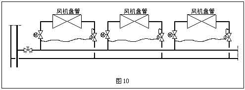 。2)圖10為風機盤管的另一種定壓調(diào)節(jié)方式,電動二通閥安裝在風機盤管進水管,壓差調(diào)節(jié)閥安裝在風機盤管出水管,通過毛細管連接電動二通閥進口和風機盤管出口,保持這兩點的壓差恒定,通過電動二通閥的脈沖式流量來調(diào)節(jié)房間溫度達到設(shè)定溫度。