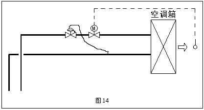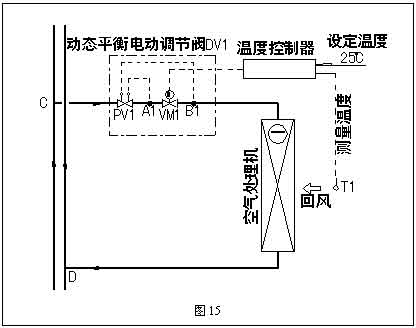 (3)圖15是空調(diào)箱(空氣處理機組)的一種新型定壓調(diào)節(jié)方式,它在空調(diào)箱供水管用一種具有動態(tài)平衡功能和電動調(diào)節(jié)功能一體的動態(tài)平衡電動調(diào)節(jié)閥來代替壓差調(diào)節(jié)閥和電動調(diào)節(jié)閥組合,同時由于它經(jīng)過專門的設(shè)計,因此具有更好的性能。這種閥一方面能避免各并聯(lián)空調(diào)箱流量調(diào)節(jié)的相互干擾,同時其實際的流量調(diào)節(jié)特性與理想的流量調(diào)節(jié)特性一致,調(diào)節(jié)性能非常好。