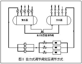 圖8為自力式調(diào)節(jié)閥定壓調(diào)節(jié)方式,通過調(diào)節(jié)自力式調(diào)節(jié)閥的開度調(diào)節(jié)分集水器旁通管的旁通水流量,從而保證分集水器的壓差為設(shè)定壓差。