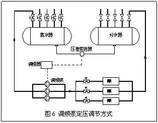 圖6為調(diào)頻泵定壓調(diào)節(jié)方式,通過調(diào)頻器調(diào)節(jié)調(diào)頻泵的轉(zhuǎn)速以調(diào)節(jié)進入分集水器的流量從而保證分、集水器壓差為設(shè)定壓差,從而保證變流量系統(tǒng)的流量隨外界環(huán)境負荷的變化而變化的要求。