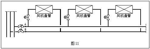 。3)圖11是一種兼顧精度和經(jīng)濟性的定壓調(diào)節(jié)方式,電動二通閥安裝在每個風機盤管的供水管,壓差調(diào)節(jié)閥安裝在風機盤管各層水平回水支管上,其另一個取壓點接在水平供水管上,通過壓差調(diào)節(jié)閥的定壓差作用以保證風機盤管水平供回水管的壓差不變,即A、B二點的壓差不變。