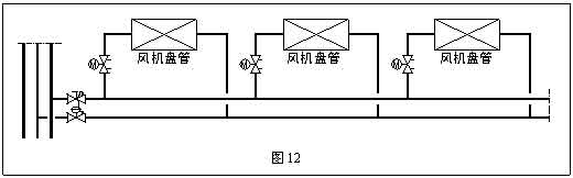 。4)圖12為水平管道異程式且風機盤管數(shù)量較多的一種定壓調(diào)節(jié)方式。水平管道回水管上安裝壓差調(diào)節(jié)閥,以保證水平供回水管的壓差恒定;在每個風機盤管供水管上安裝動態(tài)平衡電動二通閥,以保證在工作壓差范圍內(nèi),不論系統(tǒng)壓力如何變化,風機盤管的流量始終維持在設(shè)計流量。這樣就避免了層與層之間以及同層之間風機盤管流量調(diào)節(jié)的相互干擾。這種系統(tǒng)的調(diào)節(jié)精度高,抗干擾能力強,缺點是初投資較高。