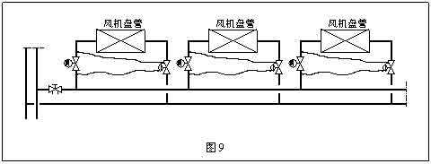 。1)圖9為風機盤管的一種定壓調(diào)節(jié)方式,電動二通閥安裝在風機盤管進水管,壓差調(diào)節(jié)閥安裝在風機盤管出水管,通過毛細管連接電動二通閥進出口,保持電動二通閥進出口壓差恒定,通過電動二通閥的脈沖式流量來調(diào)節(jié)房間溫度達到設(shè)定溫度。