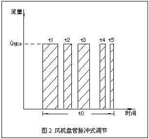 采用開關(guān)型電動閥,通過控制開關(guān)時間比來調(diào)節(jié)流經(jīng)末端設(shè)備的平均流量,如圖2所示的風機盤管系統(tǒng)房間溫度調(diào)節(jié)即為脈沖式調(diào)節(jié),其平均流量為:Q平均= Q設(shè)計(t1+t2+t3+t4+t5)/t0;這種調(diào)節(jié)方法適用于小流量,調(diào)節(jié)精度較低的末端設(shè)備;