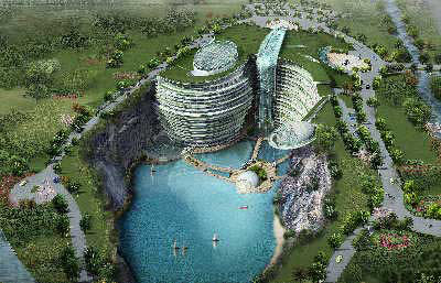 “水下2層,水面17層,坑面2層,一共約21層,只高出地平面15米左右,大部分建筑在坑里,有400個(gè)左右的房間,每間客房均設(shè)有觀景露臺(tái)!崩钚耜栠@樣介紹,酒店將依附著采石坑的南部巖壁建造,從坑底伸出地面,水面以下是水底餐廳、咖啡館和部分客房。