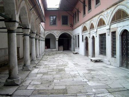 在博斯普魯斯海峽與金角灣及馬爾馬拉海的交匯點上有一座輝煌的建筑,這就是從15世紀(jì)到19世紀(jì)奧斯曼帝國的中心——托普卡普皇宮,這迷宮般的豪華至極的地方,是當(dāng)年蘇丹們辦公的地方。宮殿外側(cè)是綠木蔥郁的第一庭院,原本是宮廷餐室的第二庭院,現(xiàn)在成為帝國時代水晶制品、銀器以及中國陶瓷器的藏館。左側(cè)是蘇丹的后宮,當(dāng)年這里發(fā)生了種種陰謀。在第三庭院有謁見室、圖書館、服裝珠寶館(可看到世界第二大的鉆石)以及價值連城的中世紀(jì)的繪畫書籍。宮殿的中央是圣遺物室。
